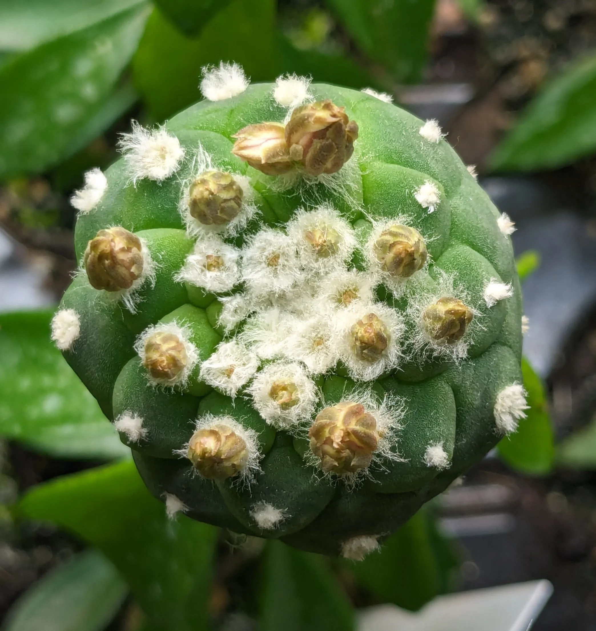 The smallest lophophora species, in our analysis it doesn’t contain mescaline but is loaded with other alkaloids.